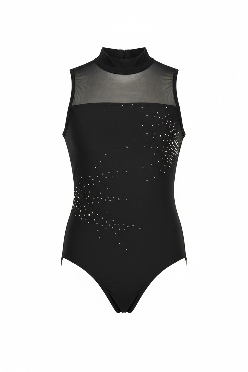 - Sleeveless leotard- Button-up turtleneck- Beautiful open arched back- Combination of mesh and microfiber