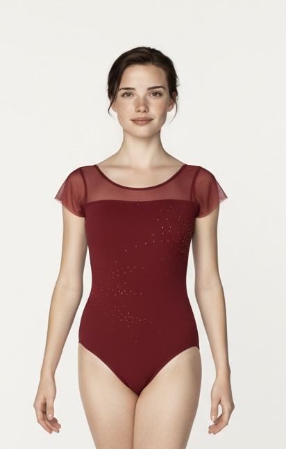 - Leotard with short mesh sleeves- Subtle curve on the back- Combination of mesh and microfiber
